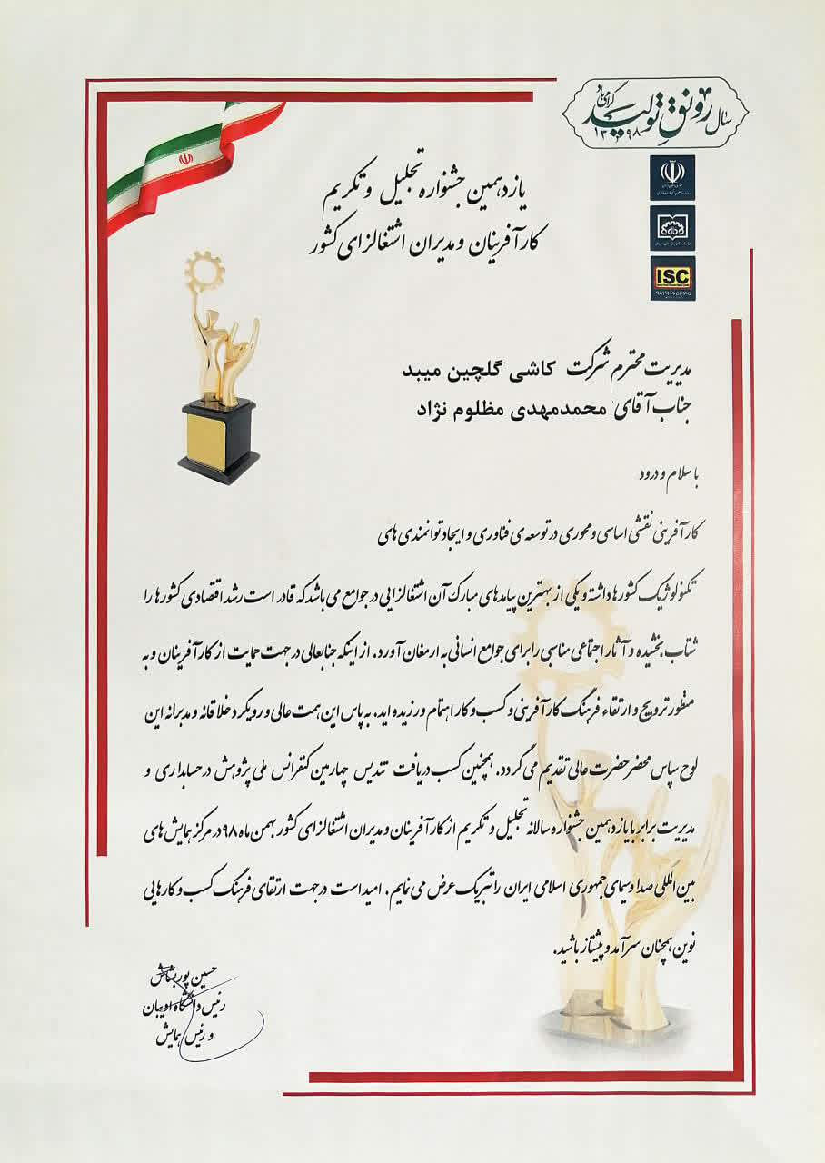 شرکت کاشی گلچین با استعانت از خداوند متعال و در راستای افزایش تولیدات داخلی، توسعه فناوری، اشتغالزایی پا به عرصه وجود گذاشت و از سال ۱۳۸۴ تولیدات خود را در زمینه محصولات کاشی و سرامیک کف و بدنه آغاز نمود و با برنامه راهبردی و سرمایه گذاری در ابعاد مختلف ، موفق به کسب افتخارات متعدد در این حوزه گردید به نحوی که تا به حال بیش از ۸ خط تولید کاشی و سرامیک در قالب فازهای اولیه و طرح توسعه دائر و و با بیشترین ظرفیت تولید در منطقه به پخت بدنه قرمز، سفید و پرسلان در سایز ها و ابعاد مختلف روی آورده و قریب به ۸۰۰ نفر به صورت مستقیم و بیش از ۳۰۰۰ نفر به صورت غیر مستقیم به کار گمارده است. این شرکت در زمینه صادرات محصولات به کشورهای عراق، افغانستان ، پاکستان، روسیه ، ارمنستان ، آفریقا ، کنیا و کشورهای حوزه خلیج فارس نیز موفق بوده و افتخارات متعددی در حوزه ملی و بین المللی کسب نموده است.